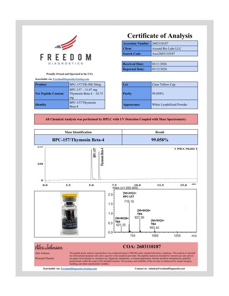 Whether you're running small-scale experiments or long-term studies, AscendBioLabs provides consistently tested peptides with clear documentation and institutional ordering support.
